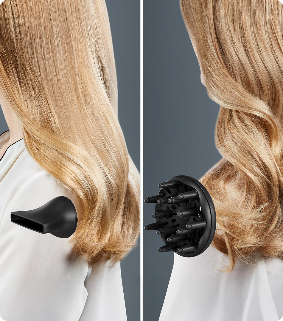 Насадка-концентратор спрямовує точний потік повітря, а дифузор надає об’єм і формує чіткі вишукані локони.