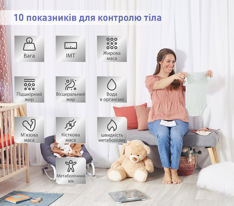З вагами Tefal GOODVIBES LIFE ви зможете вимірювати не тільки вагу, вони допоможуть вам контролювати 10 параметрів вашого тіла: вагу, ІМТ, кількість жиру, м'язову та кісткову масу, рівень води, вісцелярний та підшкірний жир, рівень базального метаболізму та метаболічний вік. Маючи таку розгорнуту інформацію, ви зможете усвідомлено керувати змінами та збалансовано коригувати лише показники, які потребують коригування.