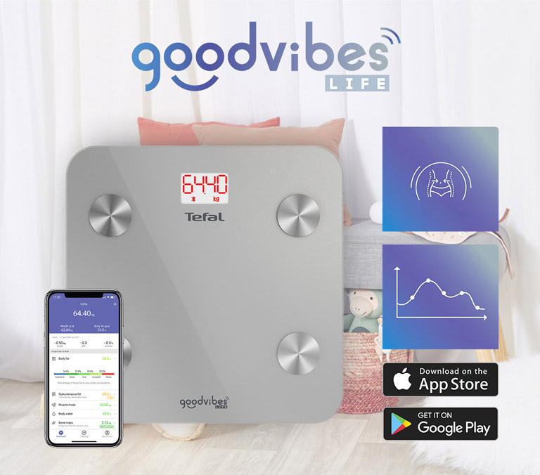 Розумні ваги Tefal GOODVIBES LIFE з простим підключенням до інтуїтивного мобільного додатку допоможуть вам краще розуміти своє тіло, ставити перед собою амбітні цілі і досягати їх. Адже Tefal розуміє, що навіть незначні зміни можуть мати для вас велике значення.